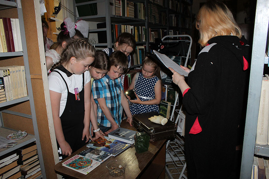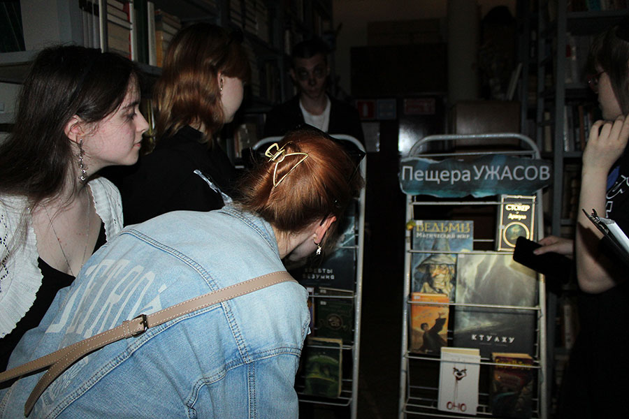 Квест «КНИГОсветное путешествие» отправил посетителей отдела «Отрочество. Юность» в мир литературных жанров. На остановке «Пещера ужасов», посвященной мистической литературе, «ужастикам» и фэнтези, участники искали вопросы на паутине, отгадывали загадки, которые охраняли летучие мыши, вспоминали произведения Николая Гоголя. Леденящую атмосферу помогли создать волонтеры Ивановского колледжа культуры: образы «Крика» и заблудившейся читательницы надолго запомнятся гостям акции.