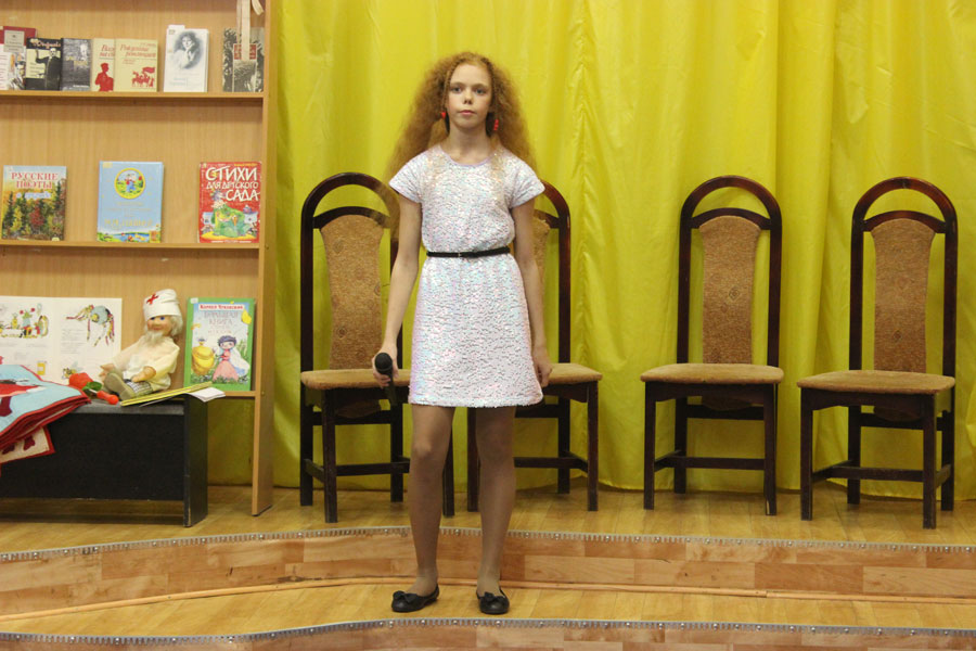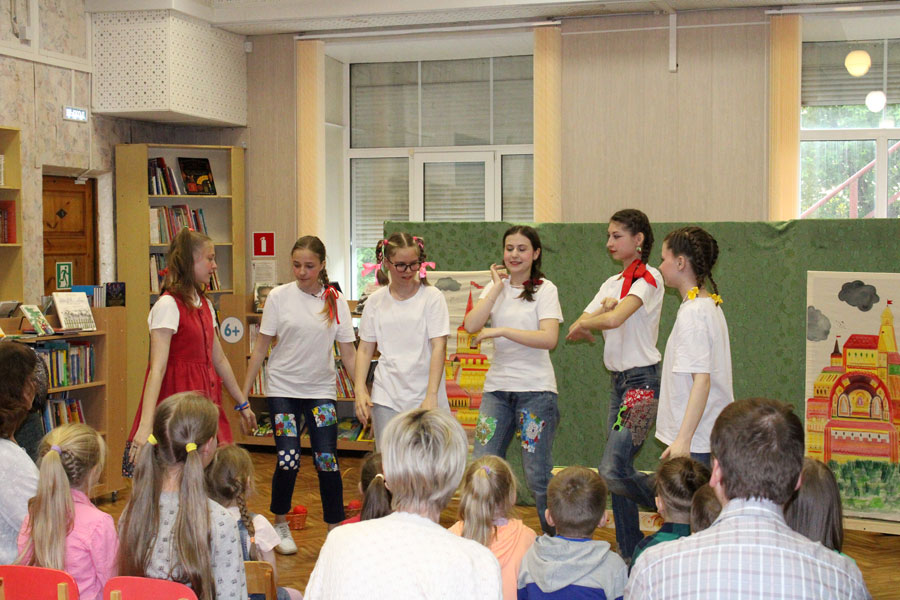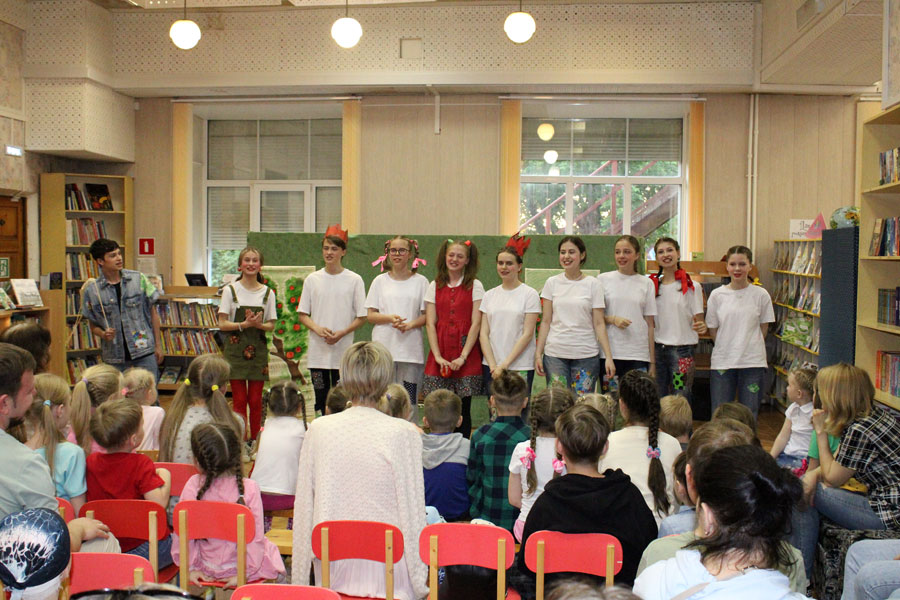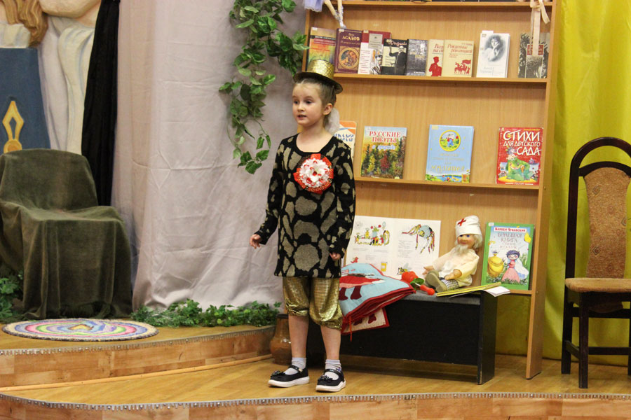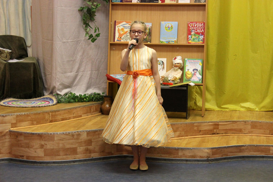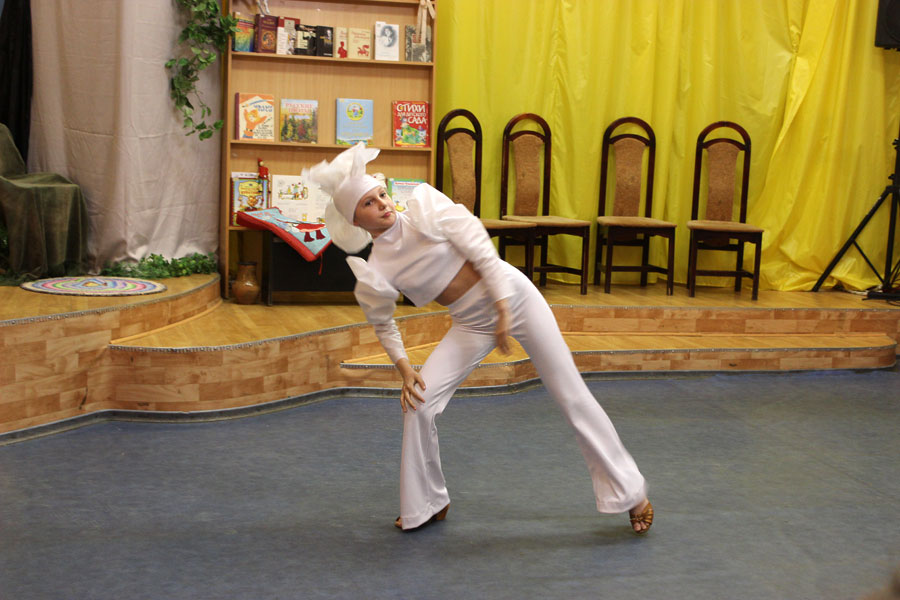 Эстафету подхватила шестилетняя Иветта Курахтанова, она прочитала стихотворение Сергея Ильина «Однажды встретились две книжки», автор которого говорит, что книжные тайны открываются лишь тем, кто бережет книги. Анастасия Потёмкина – участница «Фортуны», исполнив песню «Добрые сказки», пригласила гостей на инсценировку «Мухи-цокотухи». Удивительную композицию подарила аудитории Ульяна Кротких из школы танцев ID, паря на сцене в белом костюме, похожем на облако.