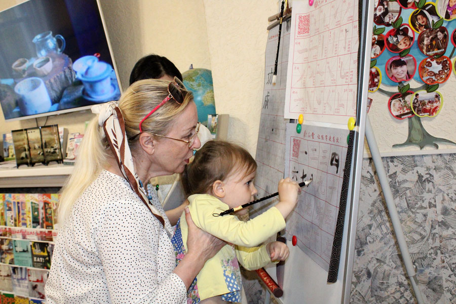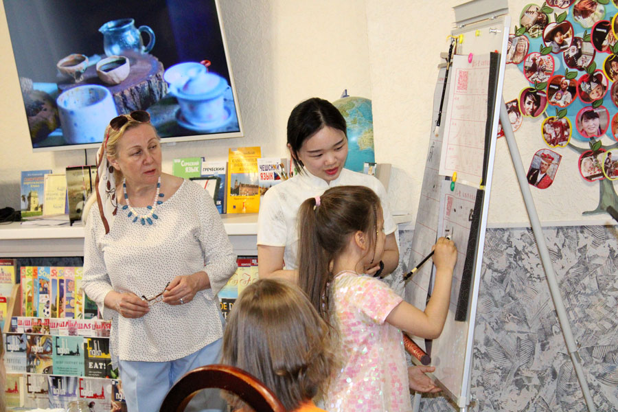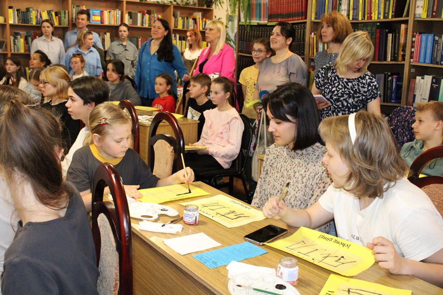 В зале «Литература на иностранных языках» была организована площадка «Дружба народов». Живой отклик посетителей получил мастер-класс по китайской каллиграфии «Волшебное искусство». Руководитель центра изучения китайского языка при филиале МШ «Интердом» имени Е.Д. Стасовой Ирина Вениаминовна Антипина вместе с преподавателем Чжан Цзин рассказали о происхождении иероглифов и правилах их написания. Каллиграфия Китая насчитывает более чем тысячелетнюю историю, это искусство требует внимания и аккуратности, а также специальных материалов. Участники мастер-класса попробовали себя в роли каллиграфистов и нарисовали два иероглифа «удача» и «счастье», которые унесли с собой на память о мероприятии.