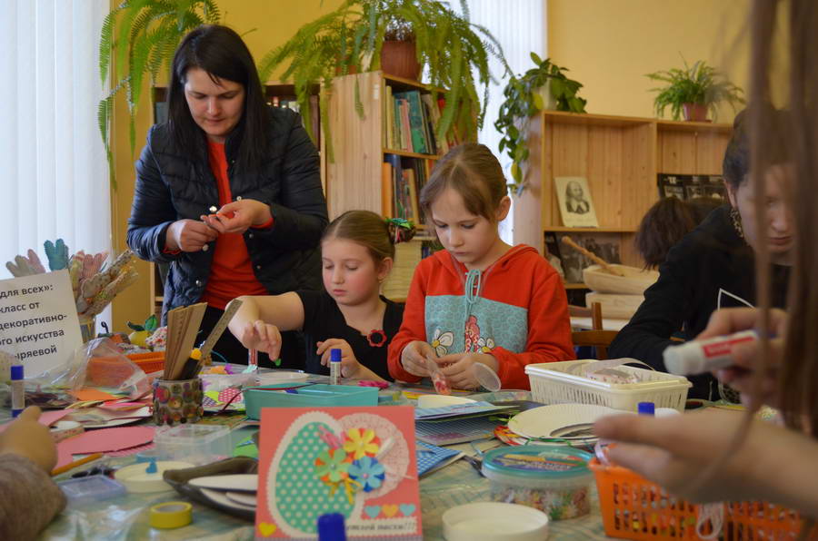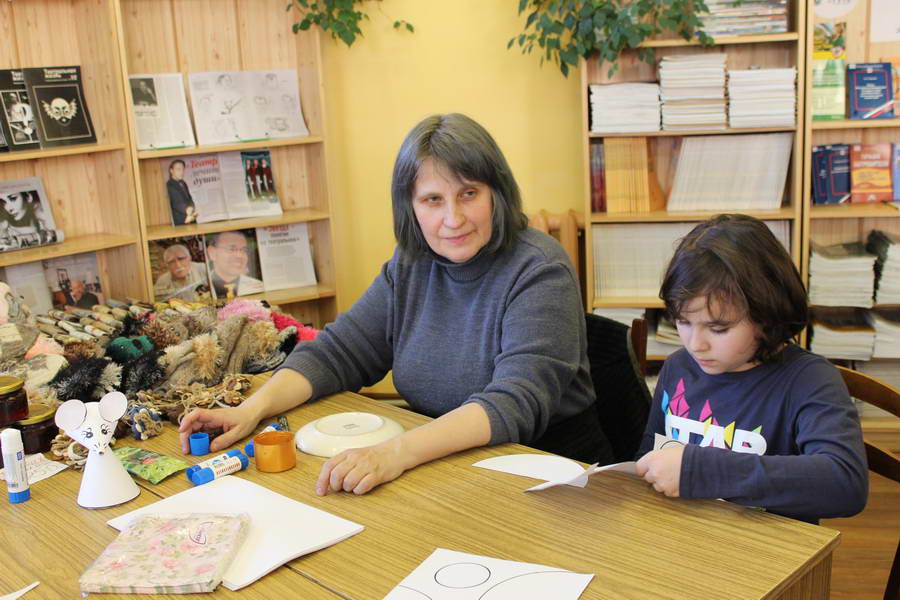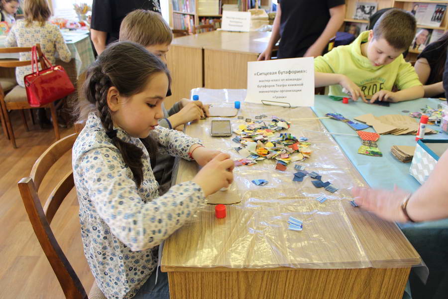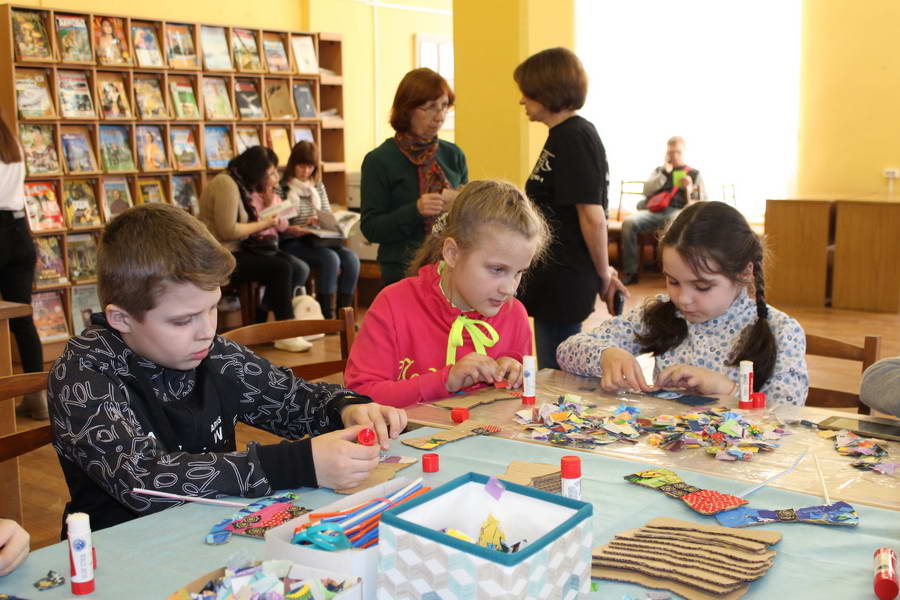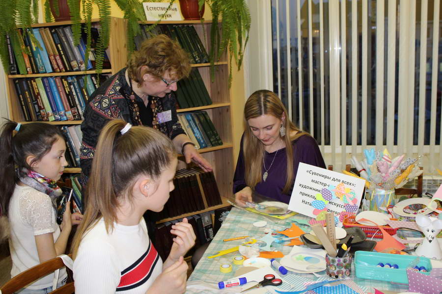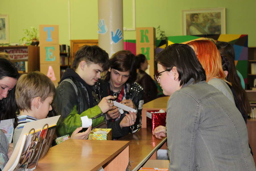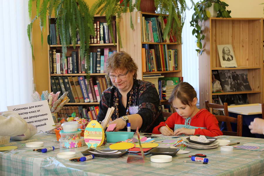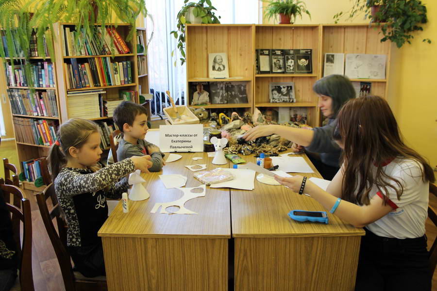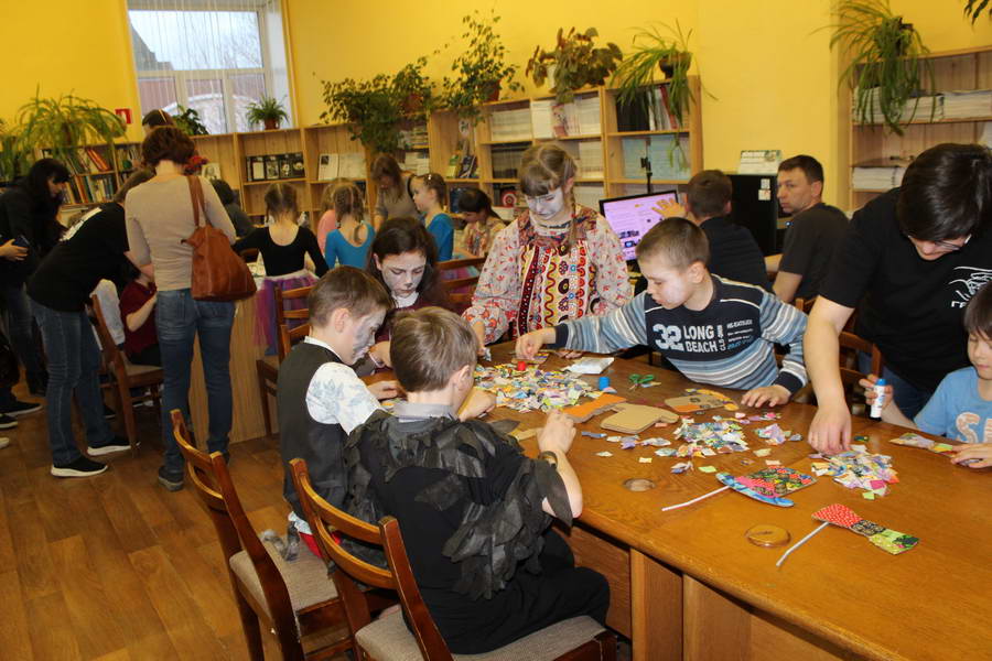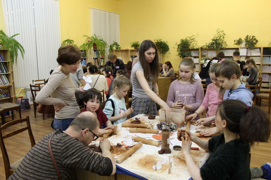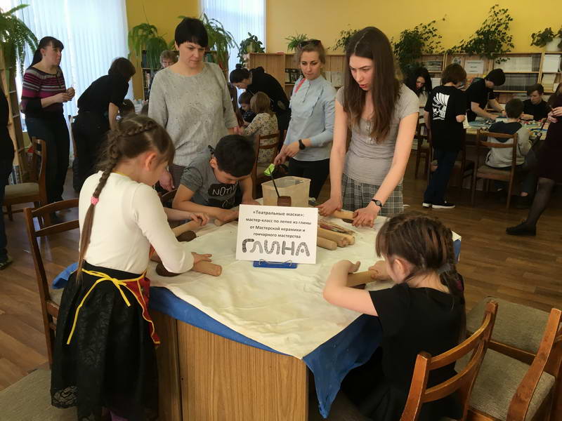 Читальный зал «Отрочество. Юность» стал площадкой для творческих мастер-классов и раскрыл «Секреты закулисья». Гости познакомились с различными видами декоративно-прикладного искусства, хобби и увлечений. Мастерская керамики и гончарного мастерства «Глина» предложила изготовить «Театральные маски». Под руководством А. Заварзиной гости раскатывали основу из глины и наносили на нее удивительные рисунки. Интересно было наблюдать как ребята придавали своим заготовкам характер и выразительность. Анастасия рассказывала участникам о нюансах работы с материалом и истории театрального атрибута. Театр книжной миниатюры Ивановской областной общественной организации молодых инвалидов и их родителей «ГРАНИ» представил мастер-класс «Ситцевая бутафория» по изготовлению текстильного сувенира. С помощью разноцветных лоскутков ткани и картонной основы все желающие изготовили шляпку и бабочку для фотосессии. Под чутким руководством художника декоративно-прикладного искусства Н. Пыряевой дети и взрослые сделали сувениры к светлой Пасхе: праздничный венок и поздравительную открытку. Юные и взрослые гости акции с удовольствием творили, проявляя свою фантазию и мастерство. Выставка-хобби и мастер-класс декоративных вязаных изделий «Игрушка театральная – очень уникальная» от Т. Рябовой раскрыла секреты по изготовлению поделок и кукол из пряжи. Е. Павлычева помогала мастерить «Мышь офисную новогоднюю» и «Летящую рыбу»: гости с удовольствием вырезали из бумаги мышку, а из природного материала сделали рыбку. Все мастер-классы были востребованы и получили положительные отклики.