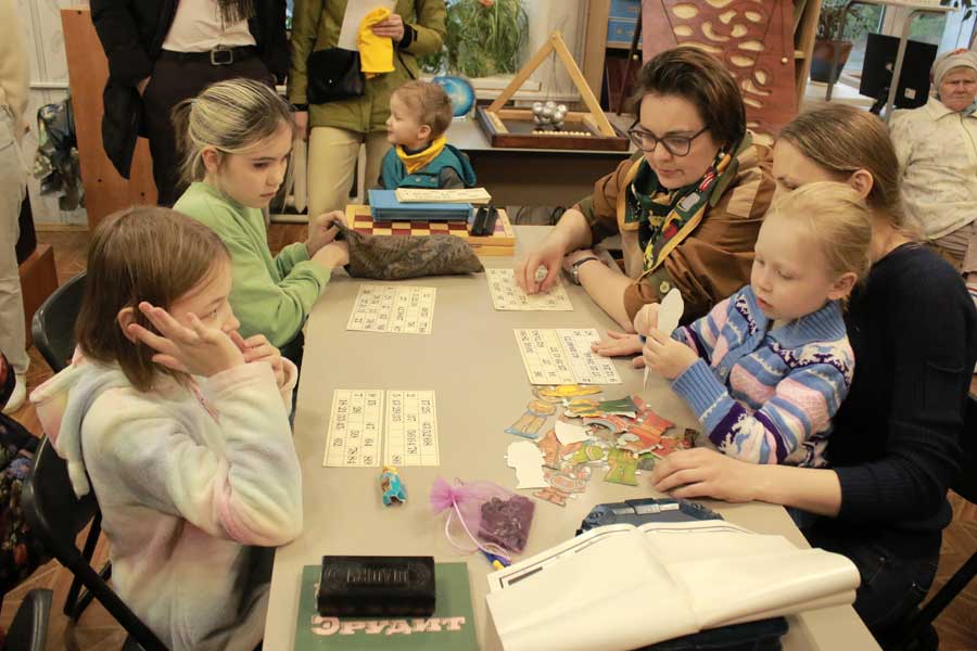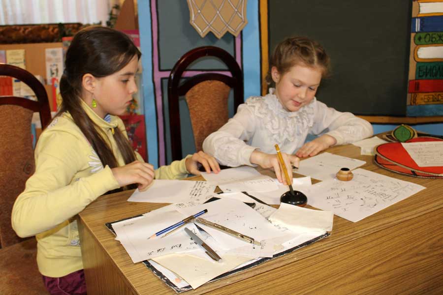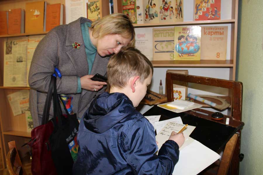 Юные посетители познакомились, а более старшее поколение вспомнило «Торжественное обещание пионера Советского Союза», научились завязывать красный галстук, увидели основные атрибуты пионеров: значки, пилотки, повязки дежурного, школьную форму, бантики, ранец. Все желающие посидели за советской партой, написали пером и чернилами буквы и слова.