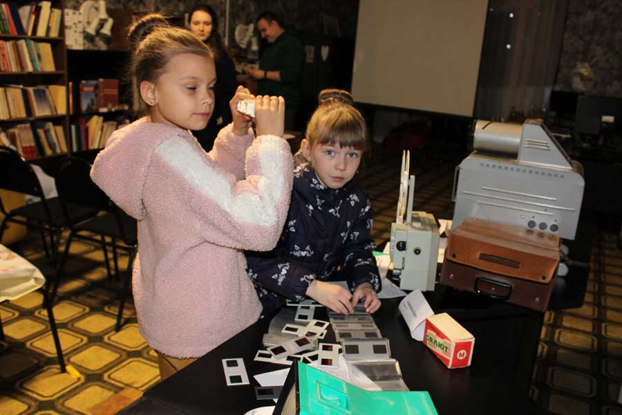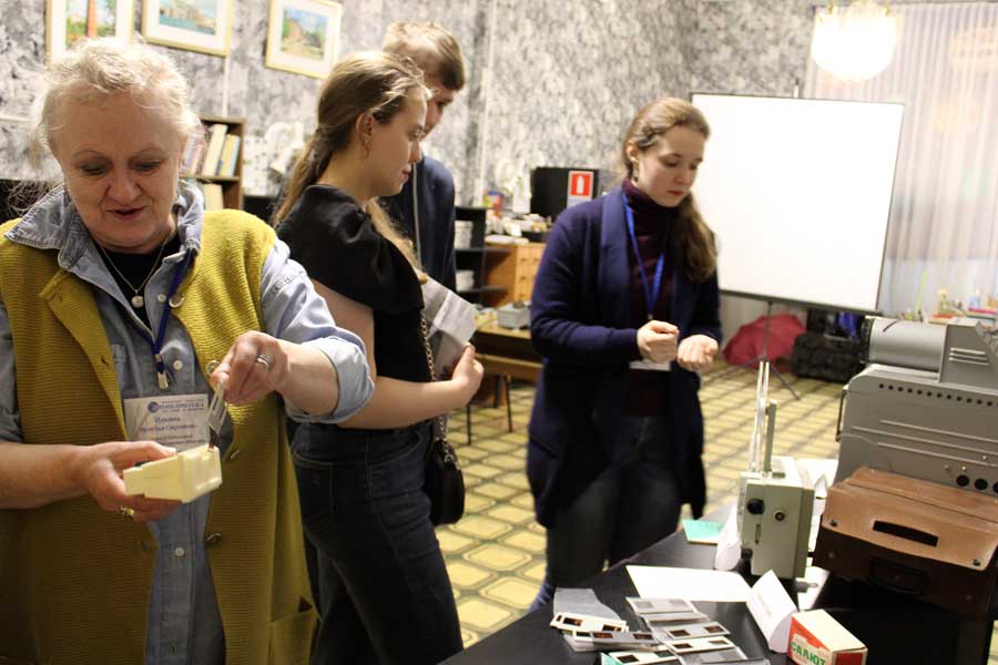 На площадке «Время в кадре» был организован просмотр диафильмов и выставка кинопроекционной техники: фильмоскопа со встроенным экраном, кинопроектора, диапроектора, эпидиаскопа. Весь вечер дети и взрослые смотрели «ожившие истории»: мультфильмы, сказки, рассказы. Особый интерес вызвала пленка с уроком литературы для 10 класса 1939 года.