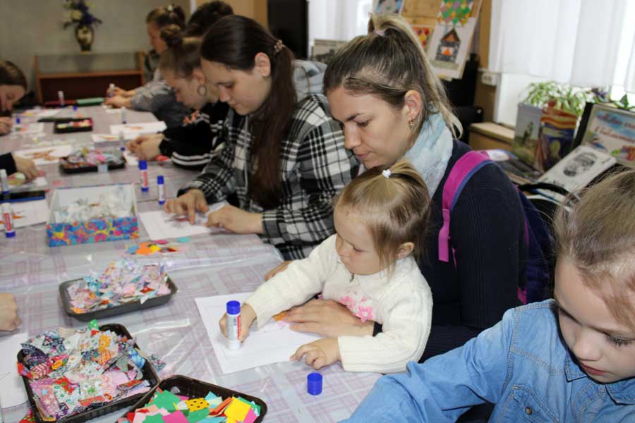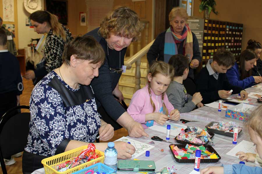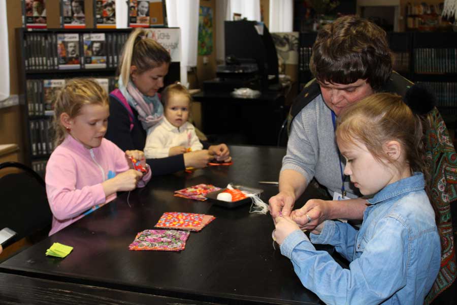 Любопытным для гостей стало изготовление лоскутного коврика. Создать многоцветный сложный узор из мелких фрагментов ткани оказалось занятием непростым, но увлекательным, а помощь в этом деле замечательного художника Наталии Пыряевой позволила каждому уйти с оригинальным сувениром. Дополнением к коврику стала «птичка счастья», чудом «прилетевшая» из тех времен, когда куклы-обереги были в каждом доме. Виктория Веселова показала, как из кусочка ткани и ниток сделать заветный талисман «на удачу».