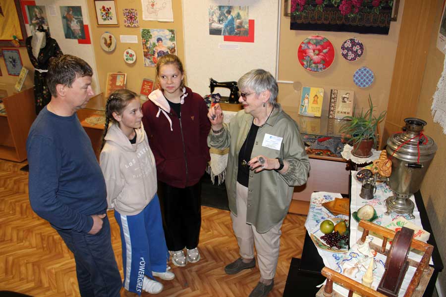 На протяжении вечера гости знакомились с выставкой «Из бабушкиного сундука». Для многих экспонаты, которые когда-то были самыми обычными предметами обихода, стали открытием. Полной неожиданностью не только для детей, но и для людей старшего поколения стала, например, деревянная палочка с острыми длинными зубцами, называвшаяся мутовкой. А между тем по своей сути и назначению, это был аналог миксера. Деревянная ребристая лопатка – рубель – не что иное, как утюг в современном понимании этого слова. Однако сюрпризы преподнесли и знакомые предметы. К созданию обычного граненого стакана, который и сейчас встречается во многих домах, оказывается, имели непосредственное отношение известные всему миру скульптор Вера Мухина и художник Казимир Малевич. Центром экспозиции стала кашемировая шаль 1860 года.
