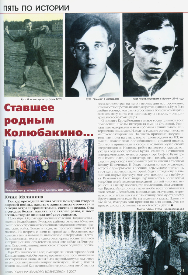 Курт Ремлинг – сын политэмигрантов, немецкий антифашист воевал в одном из партизанских отрядов с Зоей Космодемьянской и погиб осенью 1941 года у деревни Богаиха, где их разведавательно-диверсионный отряд вступил в бой с захватчиками.