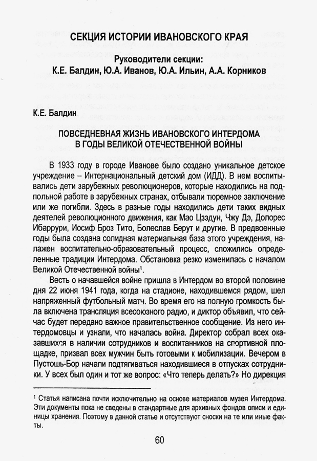 - Балдин, К.Е. Повседневная жизнь Ивановского Интердома в годы Великой Отечественной войны // Материалы III Съезда краеведов Ивановской области : Иваново, 18 апреля 2008 года, Шуя, 19 апреля 2008 года / Департамент образования Ивановской обл. [и др.]. – Иваново ; Шуя : Референт, 2008. – С. 60-66.